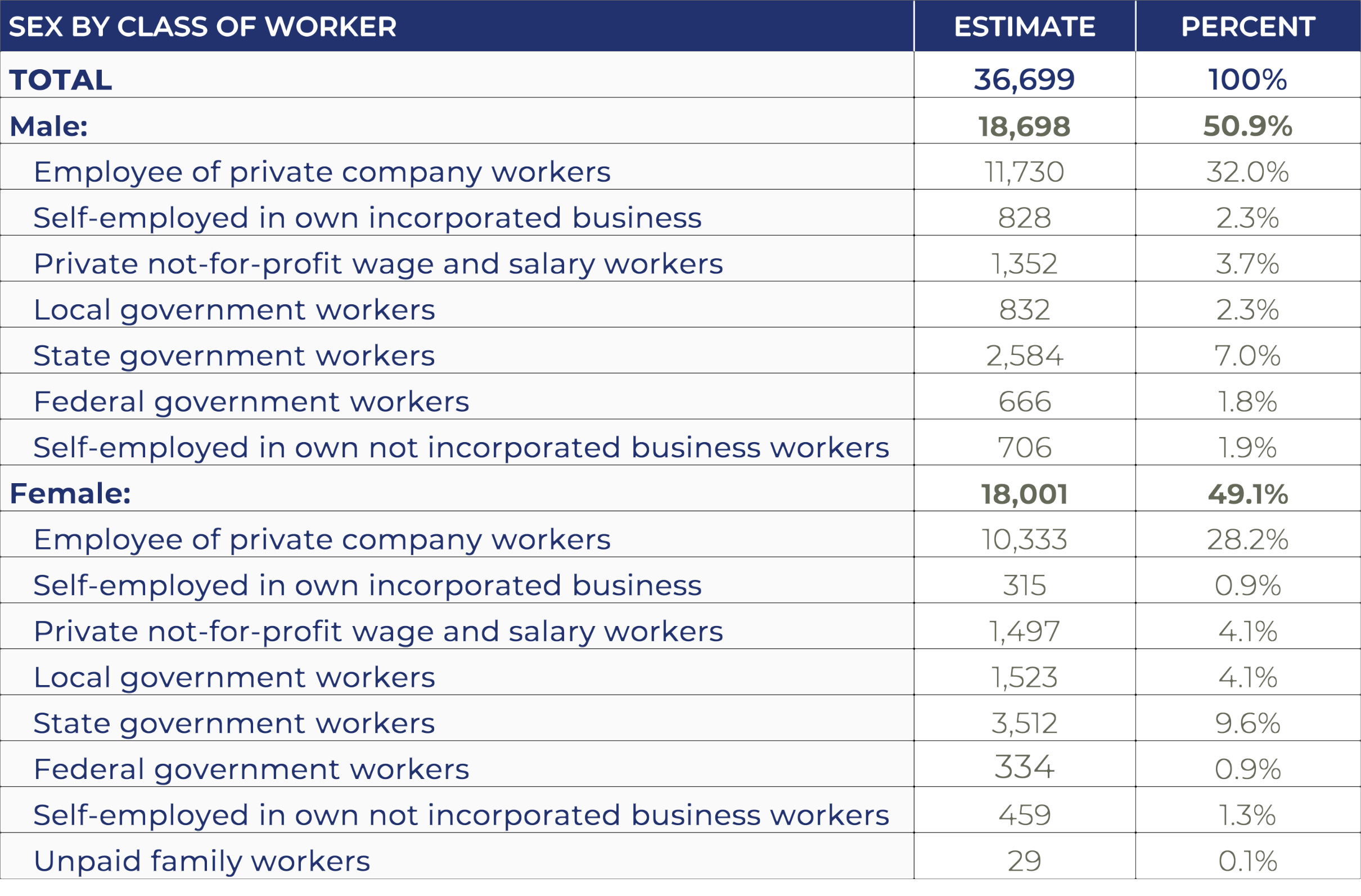 Sex by Class of Worker (Employed Population 16+):