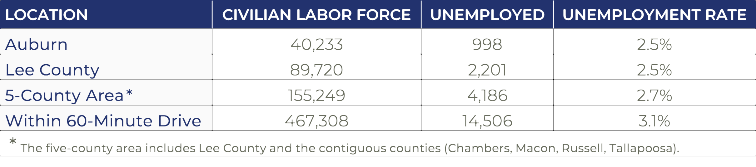Auburn's workforce consists of residents within a 60-minute drive time which includes the following Alabama counties: Lee, Barbour, Bullock, Chambers, Coosa, Elmore, Macon, Montgomery, Russell, and Tallapoosa as well as the following Georgia counties: Chattahoochie, Harris, Meriwether, Muscogee, and Troup. No manufacturing companies in Auburn are unionized.